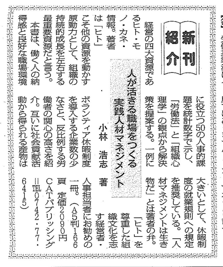書評を掲載していただきました拙著『人が活きる職場をつくる 実践人事マネジメント』の書評を『労基旬報』という専門紙に掲載していただきました。とても光栄であり、たいへん嬉しかったです。【新刊紹…