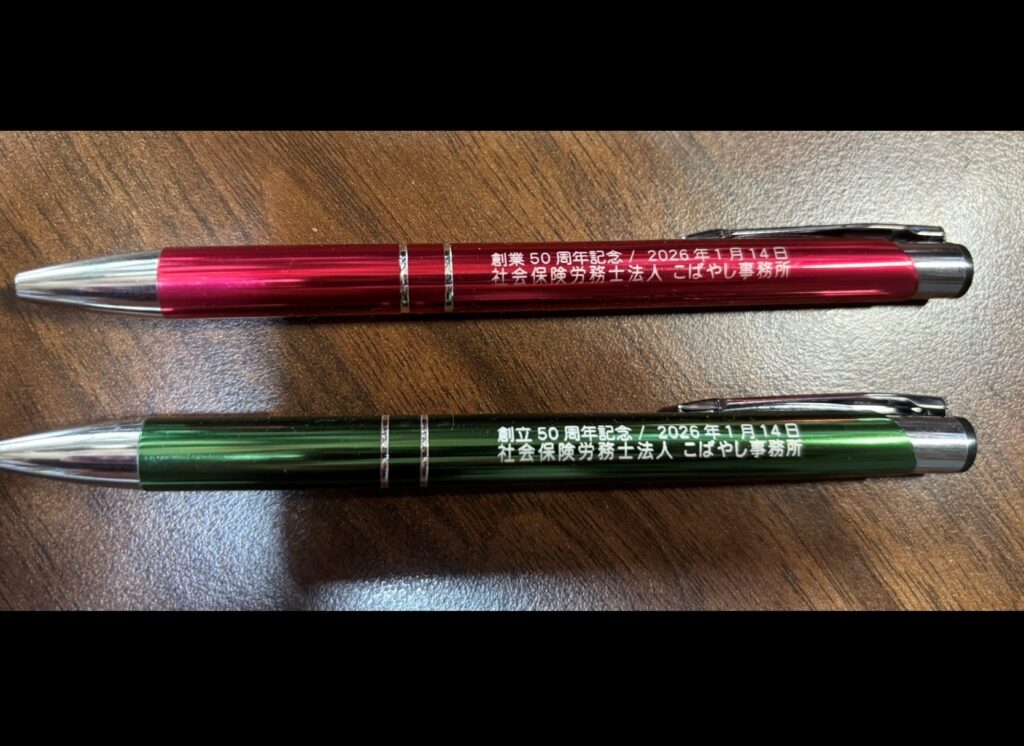 50周年記念のボールペンを作製いたしました創業50周年を記念し、顧問先さまへ配布するボールペンを作製していただきました。ささやかですが、ご笑納いただけますと幸いです。