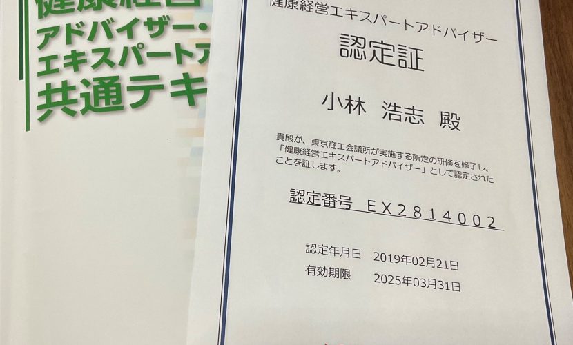 健康経営エキスパートアドバイザー / 資格更新 2023.01.30 未分類 東京商工会議所が2017年にスタートさせた掲題の資格を設置時に取得し、以後 更新を重ねております。テキストの執筆陣は、大学・シンクタンクの研究者、企業の第一線におられる方々で、非常に有意義な内容となっていました。健康経営は、現代の人事労務管理において必須事項といえ、私も研鑽を深めていく所存です。