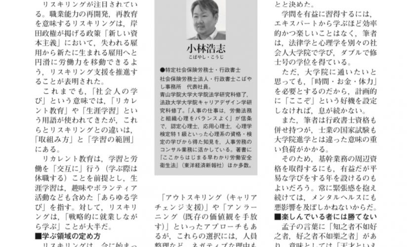 労務事情「視点」に寄稿 2024.05.2 未分類 産労総合研究所が発行する『労務事情』の「視点」のコーナーに、リスキリングに関する寄稿をいたしました。とりあえず、2回連載のうちの1回目分を掲載いたします。権威ある専門誌での執筆は光栄の極みです。またこのような機会を賜れるよう精進いたします。