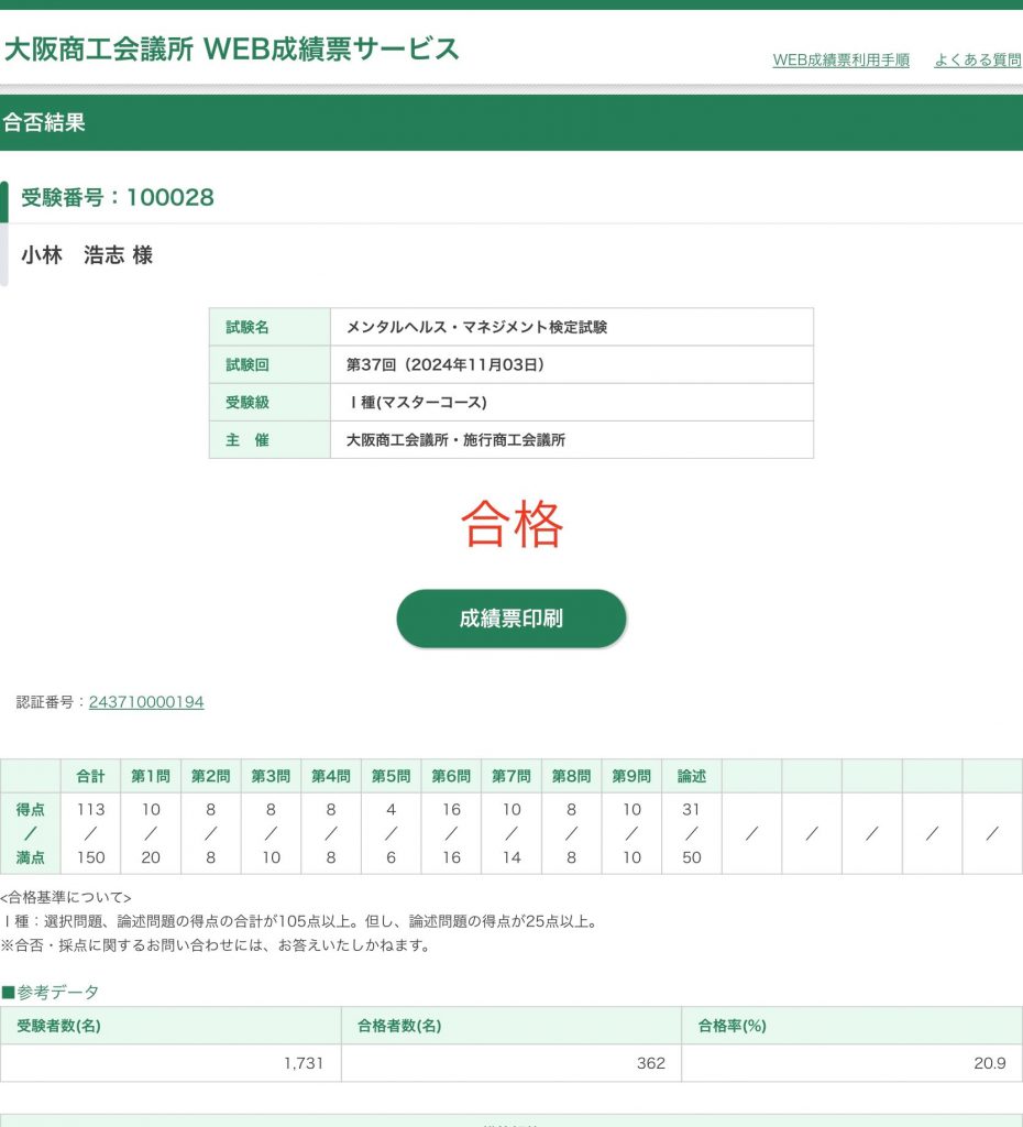 大阪商工会議所主催のメンタルヘルスマネジメント検定の第Ⅰ種マスターコースに合格しました。合格率20%の それなりに難関試験でしたが、自分なりの準備で対応いたしま…