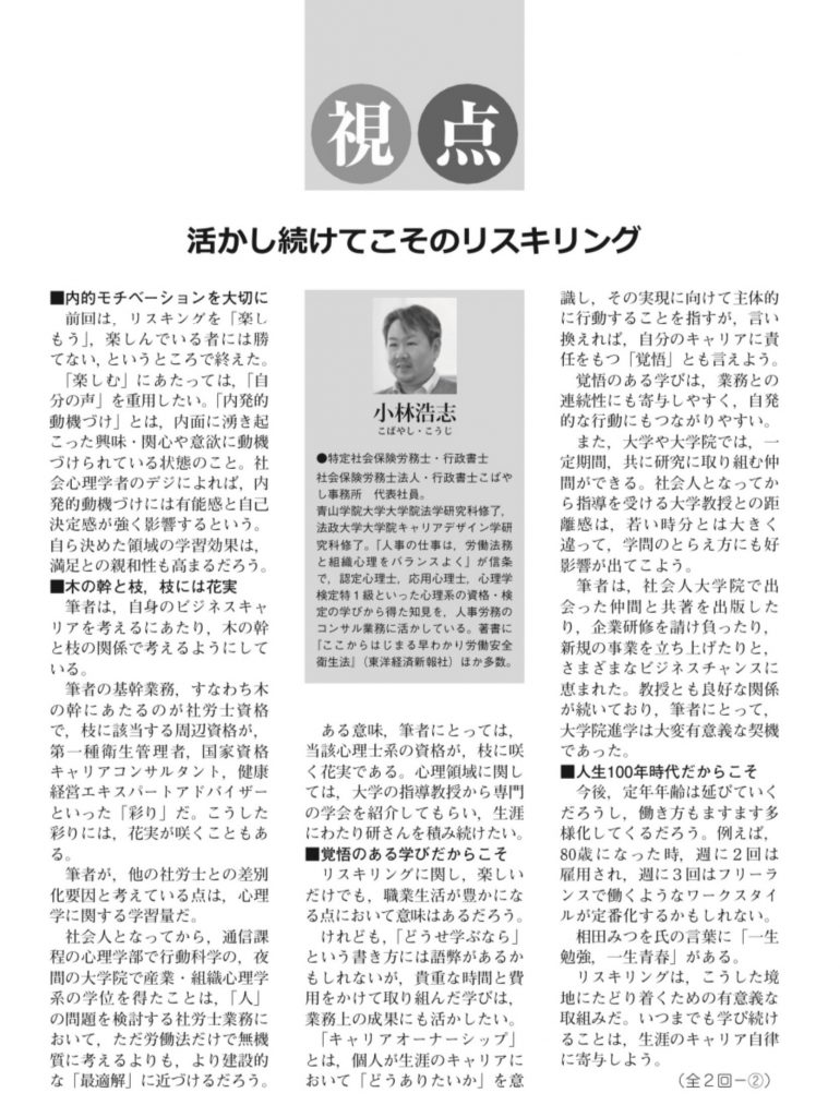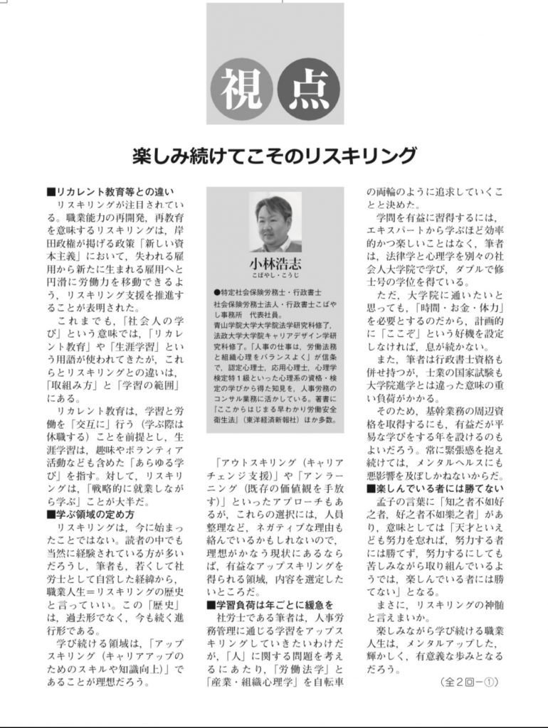 産労総合研究所が発行する『労務事情』の「視点」のコーナーに、リスキリングに関する寄稿をいたしました。とりあえず、2回連載のうちの1回目分を掲載いたします。権威あ…