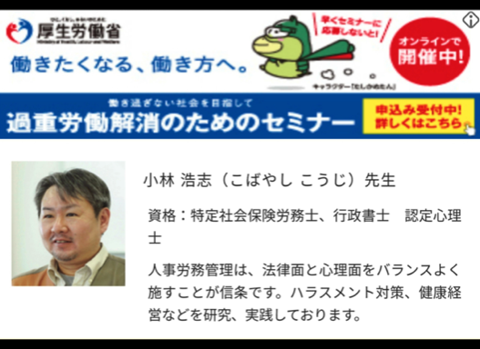 厚生労働省の委託事業「過重労働防止セミナー」の講師職を担当しています。豊富な実務経験と調査事例を保持しています。働く人は会社の宝。