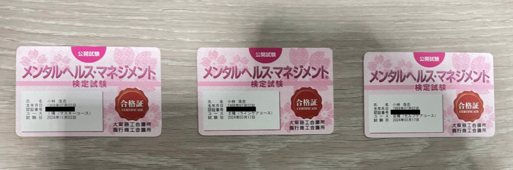 さらには、メンタルヘルスマネジメント検定のⅠ種(マスターコース)、Ⅱ種(ラインケアコース)、Ⅲ種(セルフケアコース)の全てをコンプリートしており、貴社の総合的なメンタルヘルス対策に貢献します。