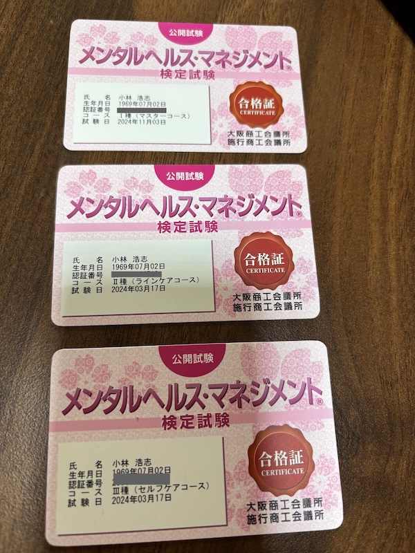さらには、メンタルヘルスマネジメント検定のⅠ種(マスターコース)、Ⅱ種(ラインケアコース)、Ⅲ種(セルフケアコース)の全てをコンプリートしており、貴社の総合的なメンタルヘルス対策に貢献します。